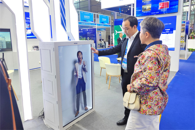 为客户介绍透明屏展示柜